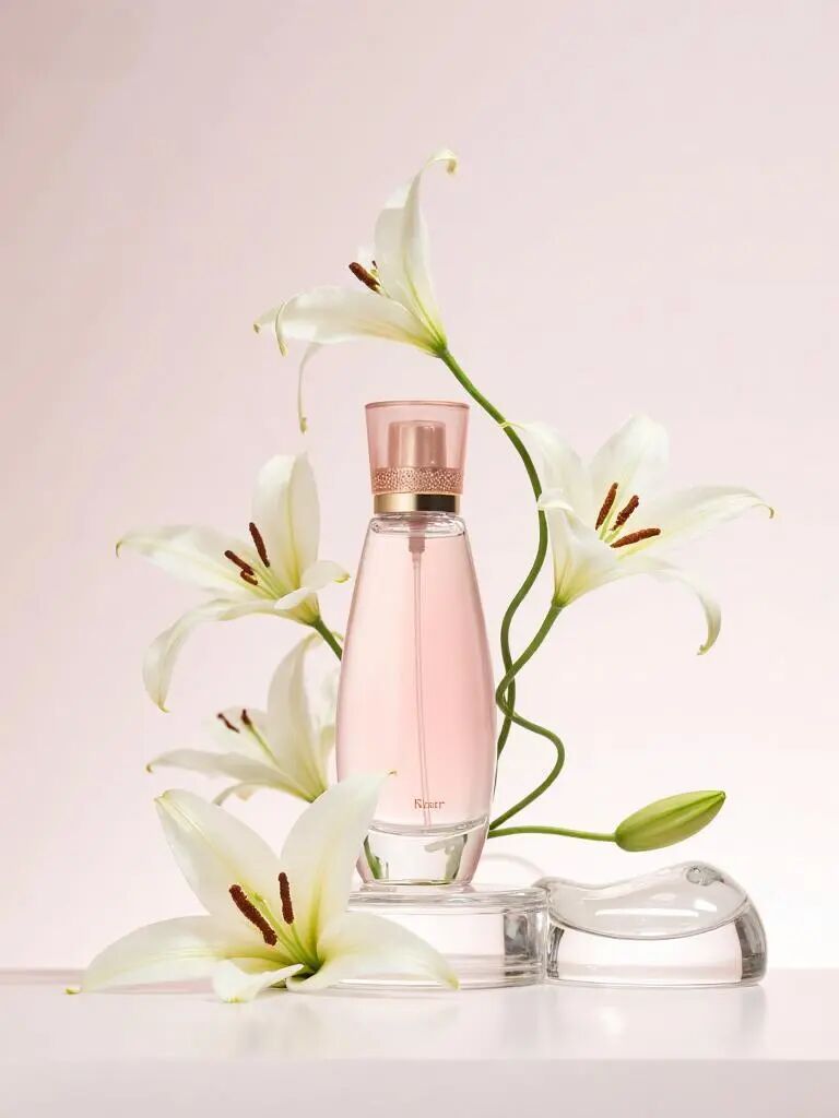 把图1中的产品替换为图2中的香水,合理处理环境光线和投影