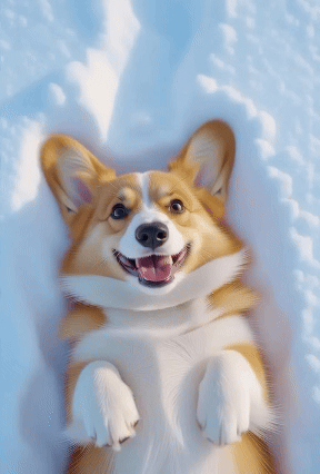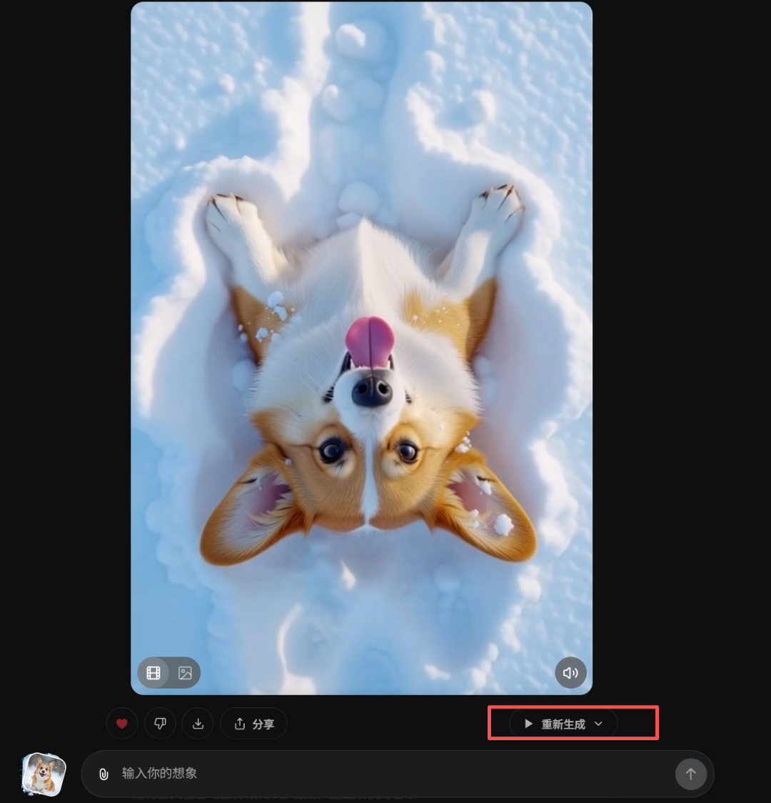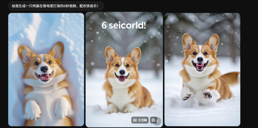 直接输入提示词:“给我生成一只柯基在雪地里打滚的6秒视频,配欢快音乐!”