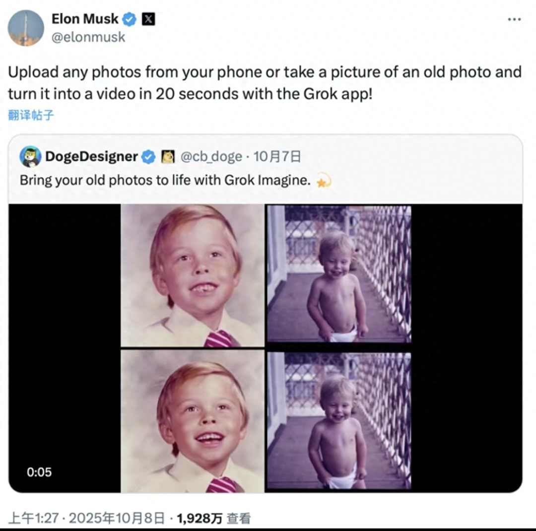 最让人惊掉下巴的是它的两大杀手锏:20秒出片+全免费开放。要知道,一周前OpenAI刚发布的Sora 2还在玩“饥饿营销”,不仅生成一段视频要磨磨蹭蹭一两分钟,还藏着掖着搞邀请制,普通用户想碰一下门儿都没有。而马斯克直接掀桌子:不管你是专业创作者还是小白,开口说话就能生成视频、图像和文本,全程不到20秒,还分文不取!