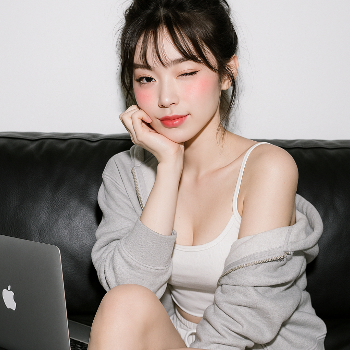 “韩式高亮闪光灯少女自拍:白皙瓷肌的东亚女孩,慵懒侧坐黑皮沙发,灰卫衣半褪香肩,白短背心与抽绳短裤,赤脚。凌乱高丸子与碎发帘,左眼下小痣。她歪头 5°,右手背托下巴,右眼直视镜头,左眼俏皮 wink,粉嫩腮红与渐变唇,Aegyo-sal 闪亮。背景极简白墙,旁放银色 MacBook。正面 50mm 竖幅,硬闪直打,高对比冷白调,皮肤如瓷无毛孔,粉系饱和,清爽干净,禁广角、暗光、文字。”