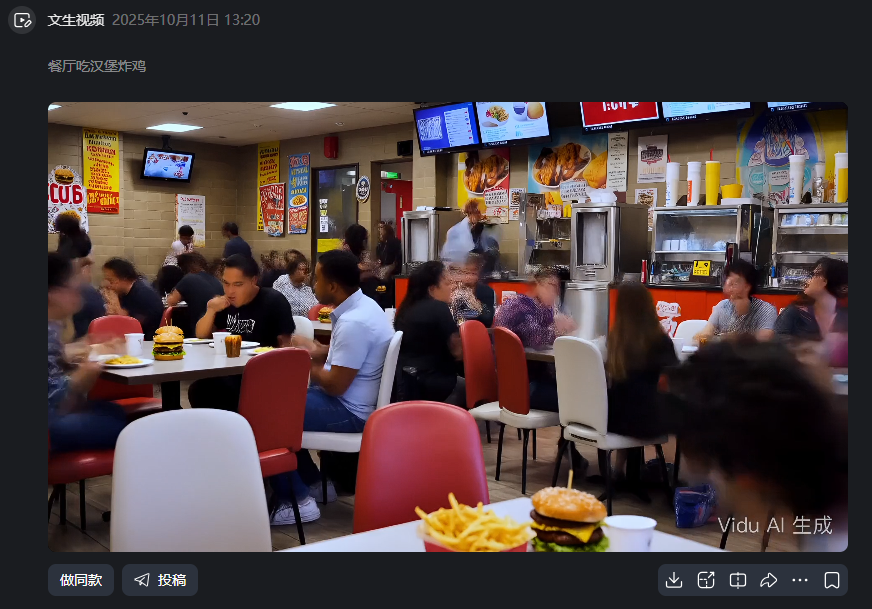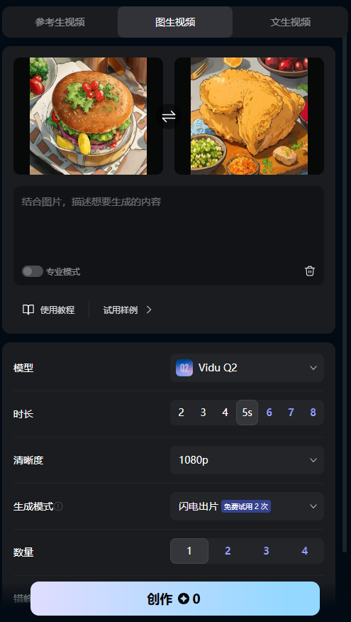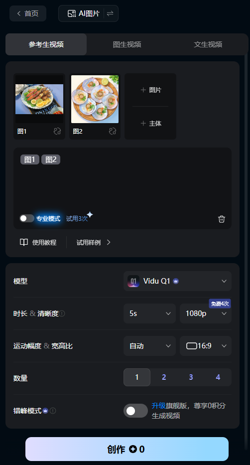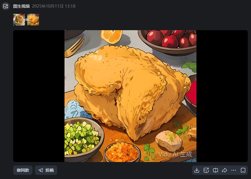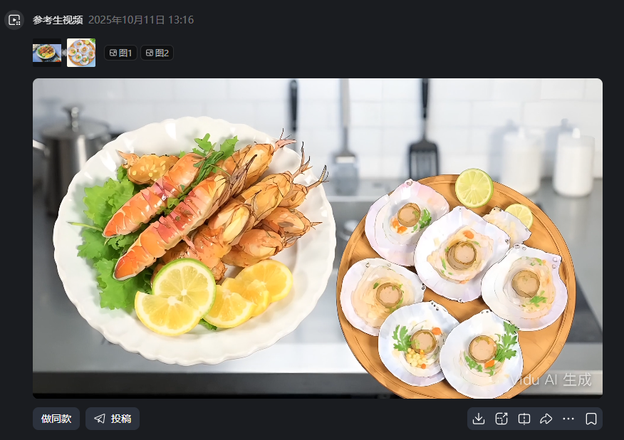 上传了2张美食图片,Vidu 能够巧妙地融合内容,生成统一风格的视频,保持主题高度一致。