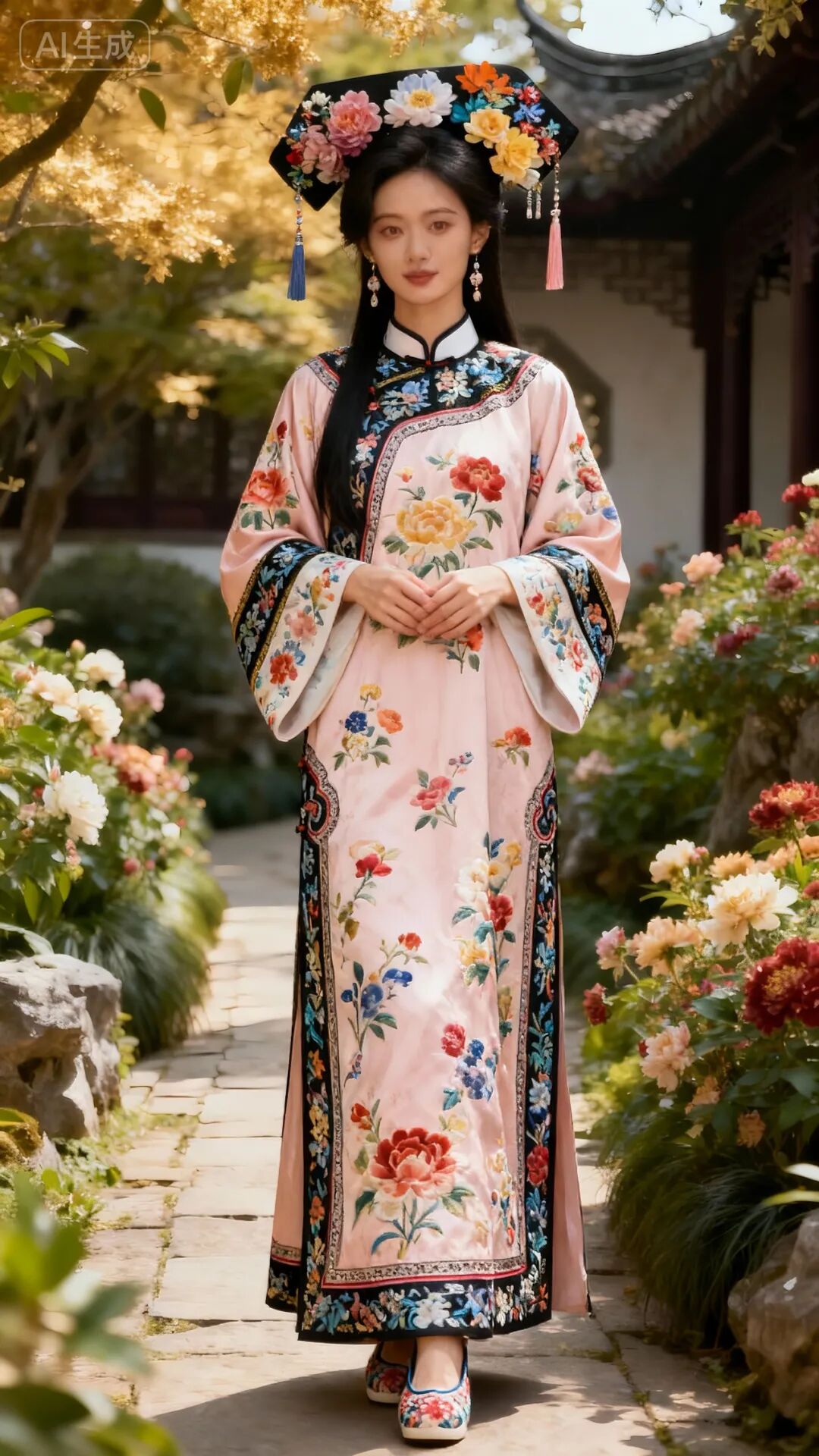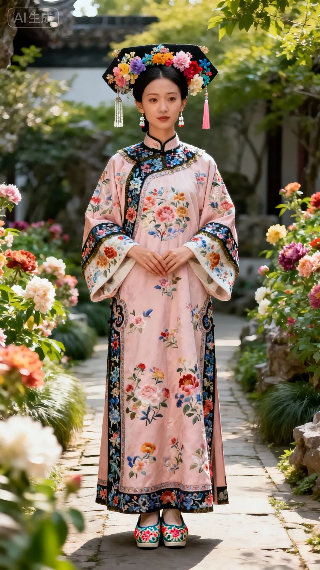 将服装换成:身着清代旗装(浅粉色衣身满绣多彩花卉,领口、袖口、下摆饰精致镶边与繁复花纹),头戴装饰各色花卉及流苏的旗头,佩戴耳饰,脚穿绣花鞋。她双手交叠于身前,背景不变,其他不变。