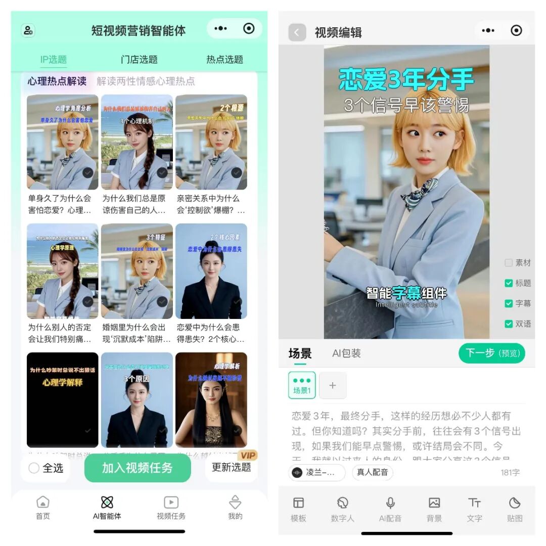 你只需录入个人或门店的基本信息,它的“IP智能体”就会自动生成适合你的选题框架和方向;选择任一方向后,AI会结合你的特点撰写文案、调用数字人出镜,并自动完成配音、剪辑与包装。无论是个人还是商家,都能通过“智能体”快速生成突出卖点的视频内容。