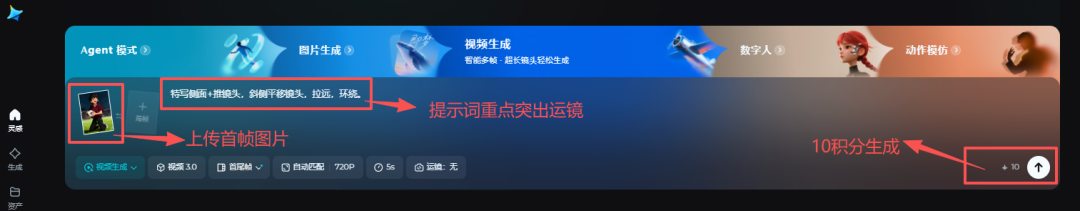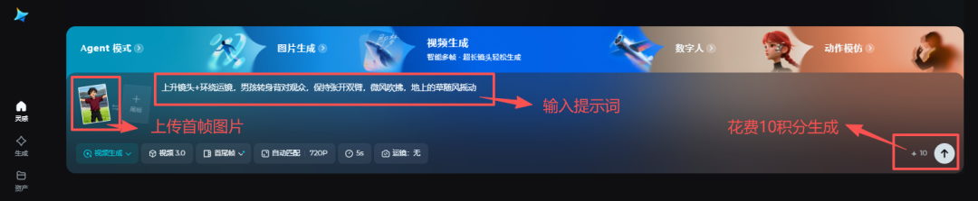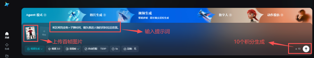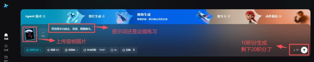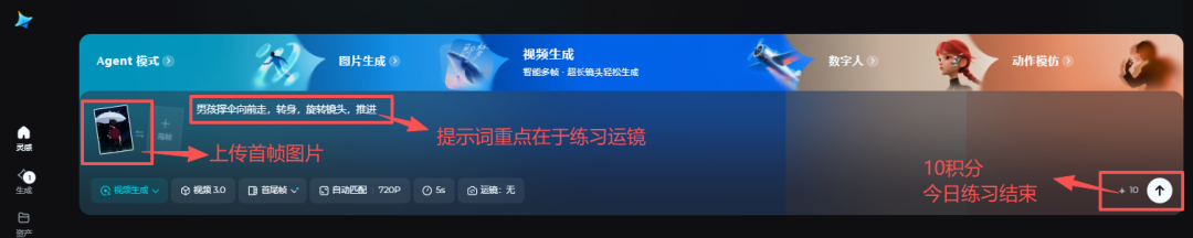特别提醒:使用即梦AI的图生视频功能需要上传首帧图片,输入提示词,再花费10个积分,即梦AI每天登录免费送60积分,可以练习6个5秒的图生视频;因此,请慎重填写提示词后再点击生成,毕竟免费机会有限。