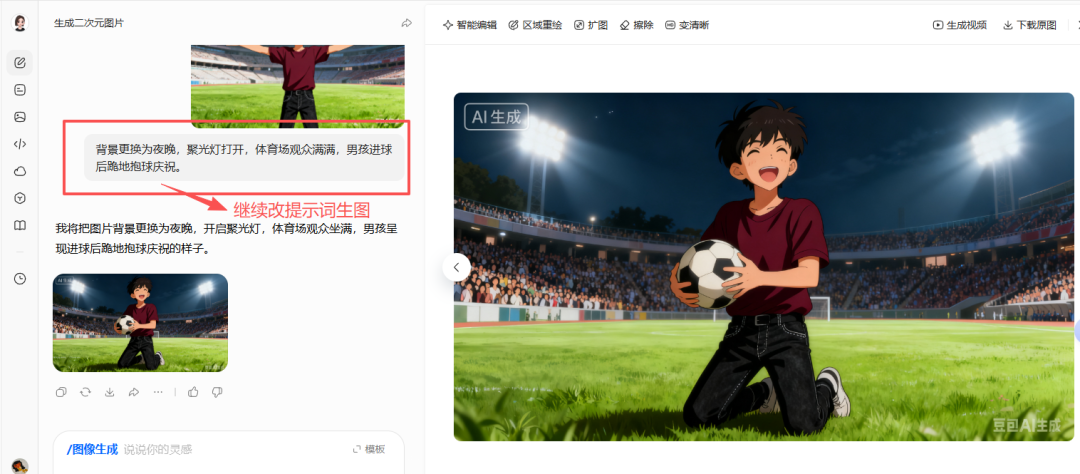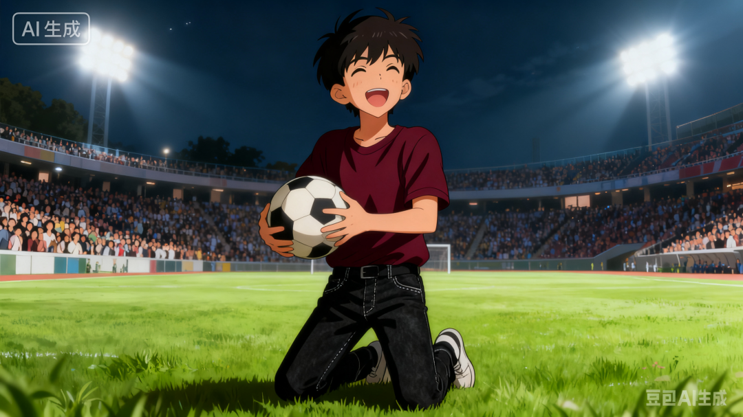 ③背景更换为夜晚,聚光灯打开,体育场观众满满,男孩进球后跪地抱球庆祝。