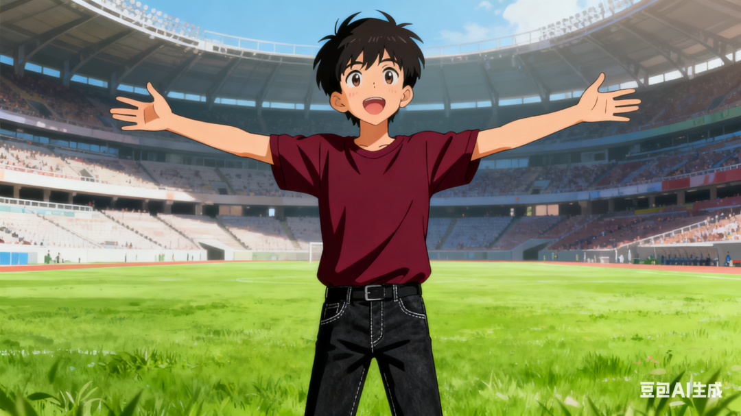 ①男孩张开双臂,衣着黑色牛仔裤,深红色短袖T恤,站在一片绿色的草地上,周围是体育场造型。