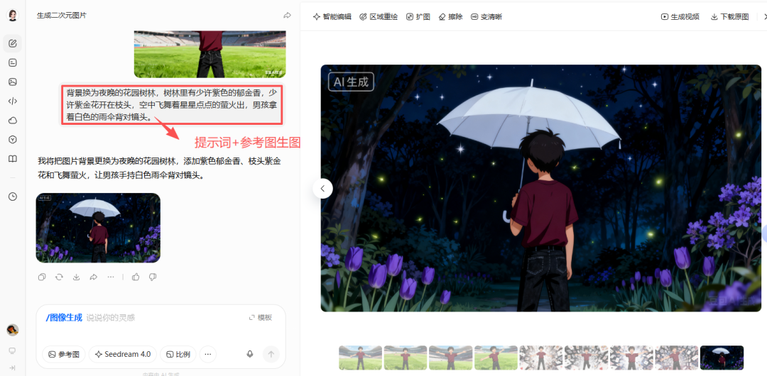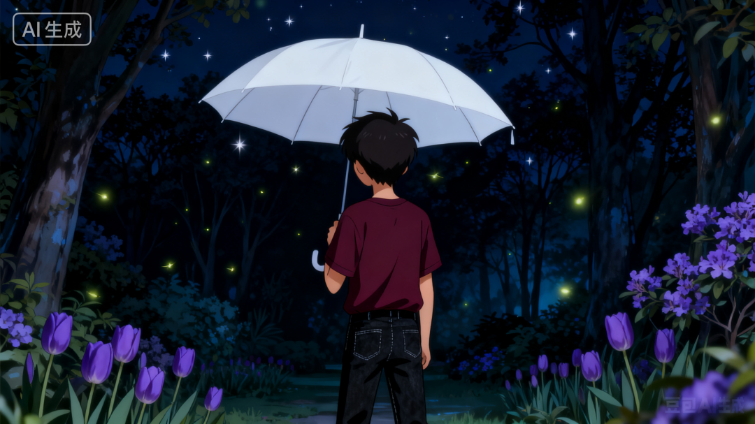 ④背景换为夜晚的花园树林,树林里有少许紫色的郁金香,少许紫金花开在枝头,空中飞舞着星星点点的萤火虫,男孩拿着白色的雨伞背对镜头。
