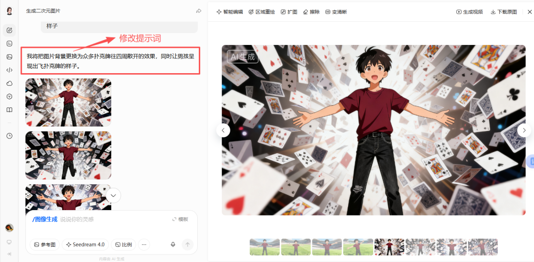②背景换为众多扑克牌往四周散开,男孩表现出在飞扑克牌的样子。