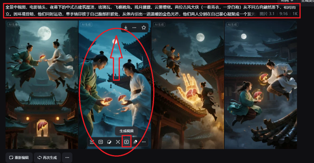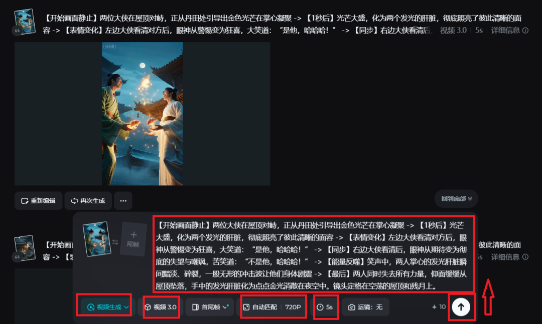 选择一张自己满意的图片,把鼠标移到其上,点击【生成视频】图标,再把deepseek生成的图生视频提示词复制粘贴到此文本框,再点击右下角的箭头,生成一个5秒静默视频。