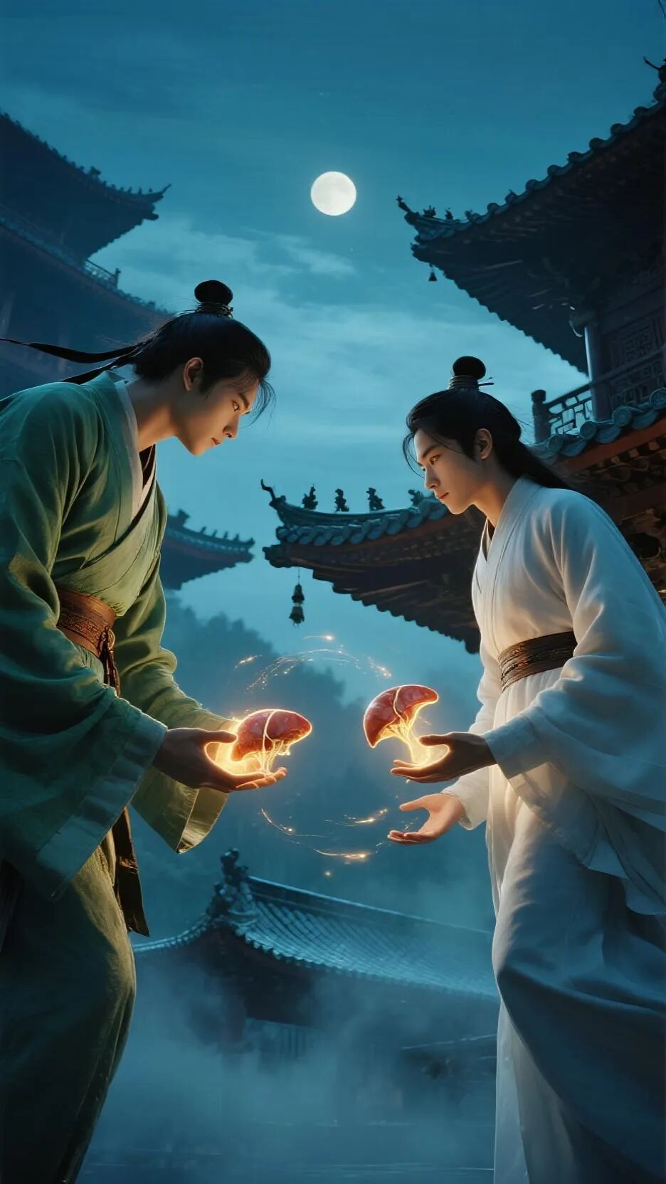 全景中视图,电影镜头,夜幕下的中式古建筑屋顶,琉璃瓦,飞檐翘角。残月朦胧,云雾缭绕。两位古风大侠(一着青衣,一穿白袍)从不同方向翩然落下,相对而立。因环境昏暗,他们同时运功,单手结印按于自己腹部丹田处,从体内引出一道温暖的金色光芒,在掌心凝聚成一个发光的肝部。光芒柔和而明亮,照亮了彼此警惕而又期待的脸庞。超级写实摄影,细节极致,仙侠意境,光影效果绝佳。