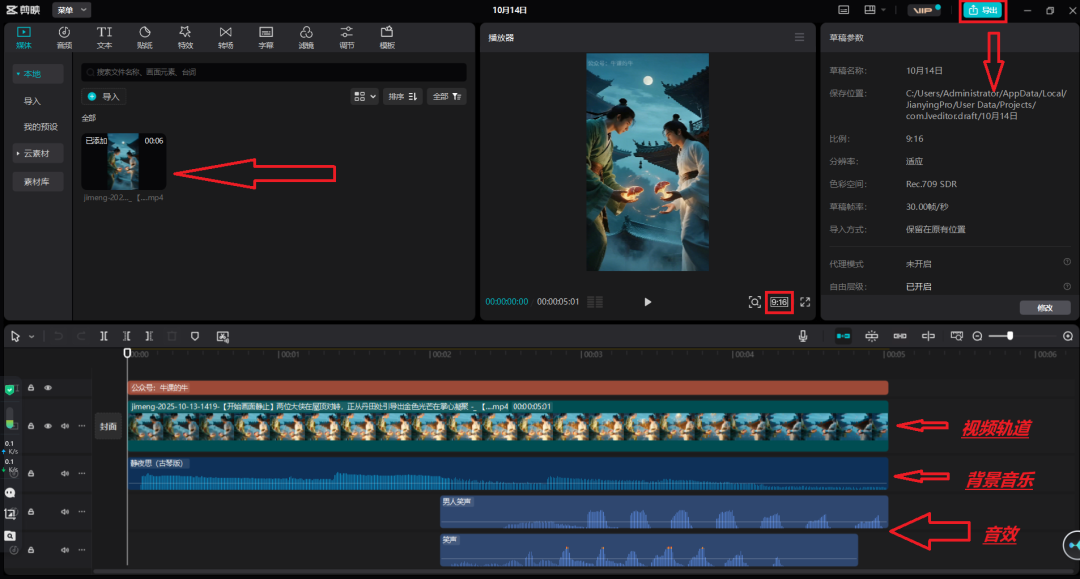 把从即梦生成的视频导入剪映,加上背景音乐,加上音效,导出保存即可。