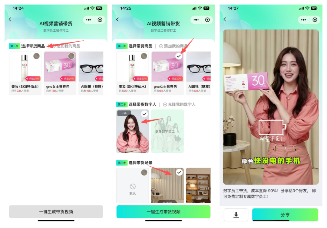 具体用下来有多省事儿?我传了一张自己穿通勤装的正面照(得无遮挡,不然克隆不清晰),3 分钟就生成了数字人;上传产品图输入卖点,AI 自动写的文案很贴生活,口型精准对上了,不用再手动调帧。最关键的是,生成的视频自带字幕,直接就能发,一条视频从开始到结束才几分钟,比用可灵 + 剪映快了近 3 倍。