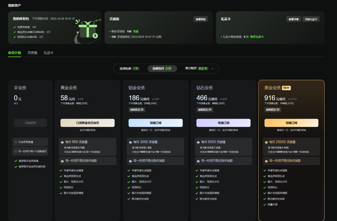 最先试的是快手的可灵 AI,2.5 Turbo 版降价后,黄金会员首月才 46 元,后续 58 元 / 月送 660 点灵感值,生成一条 15 秒 1080p 的视频大概耗 25 点,单条成本不到 2.5 元,单论 “生成” 性价比确实高。