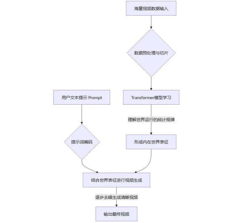 它的核心是基于Transformer架构的扩散模型。这个模型通过观看数以亿计的视频片段,学习到了物体、环境和它们之间互动的统计规律。当模型看到足够多的“球从高处落下”的视频后,它就“理解”了重力的大致作用方式,尽管它并不知道牛顿定律的公式。