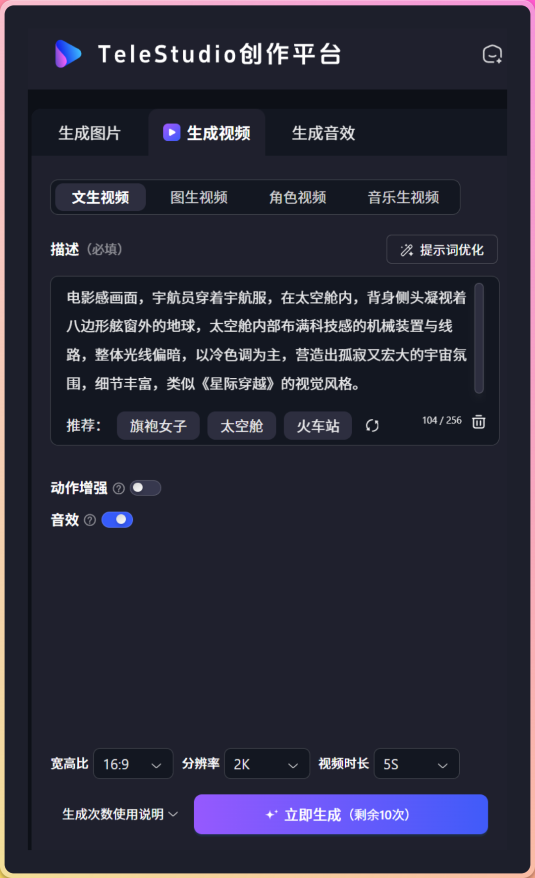 普通用户生成图片数量不限次,每天可以生成10个视频