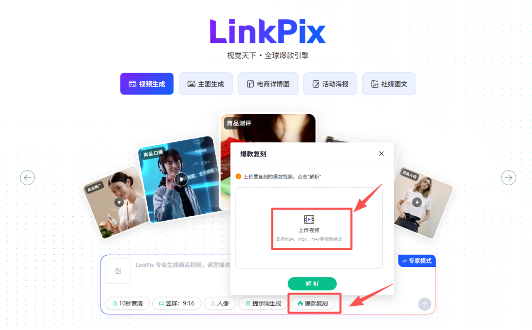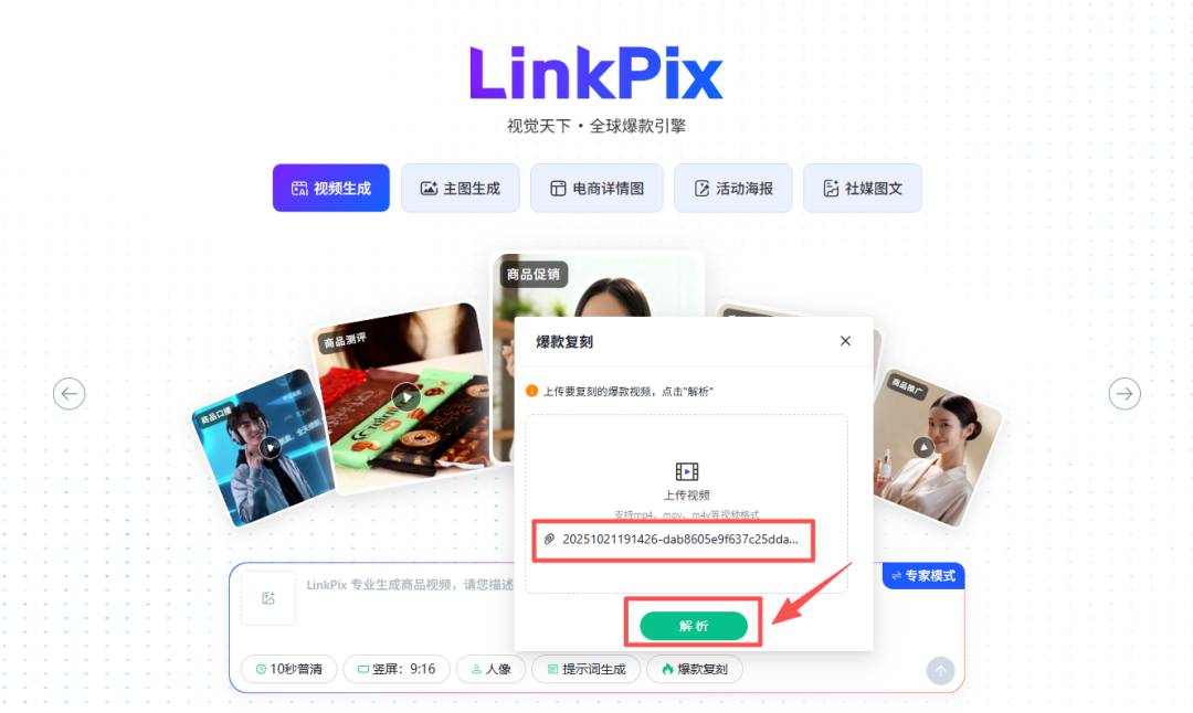 LinkPix 的 爆款复刻完美解决了这些问题,以 “复制 + 升级” 为核心,从根源拆解爆款逻辑,让你一键 “借势” 流量,合规复刻、高效创作,短视频变现速度直接翻倍!