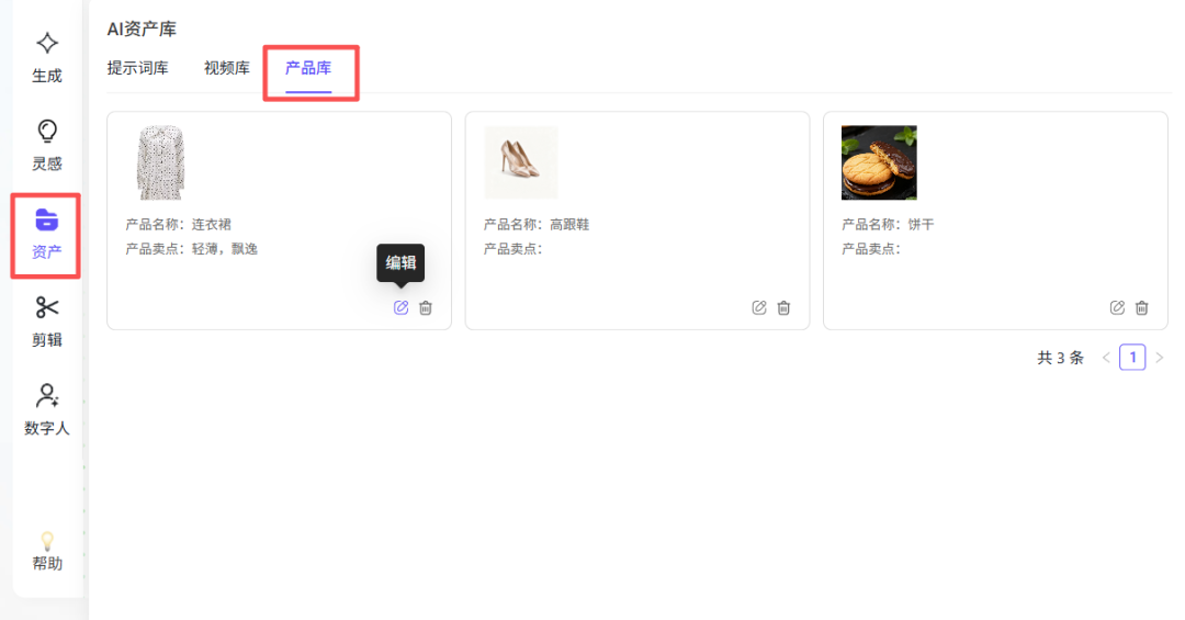 新增AI资产库功能,建立个人专属素材资源库,实现提示词、视频、产品图的集中管理和重复复用,减少素材丢失风险,避免重复上传和构思,让素材利用更充分,创作流程更顺畅。