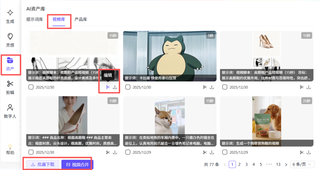 平台内生成的所有视频自动保存,支持批量编辑、合并、下载,视频素材管理、创作更高效;
