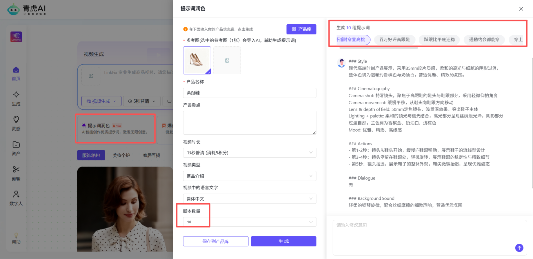 提示词润色支持单次生成10份提示词脚本,按需选择提示词生成视频 。