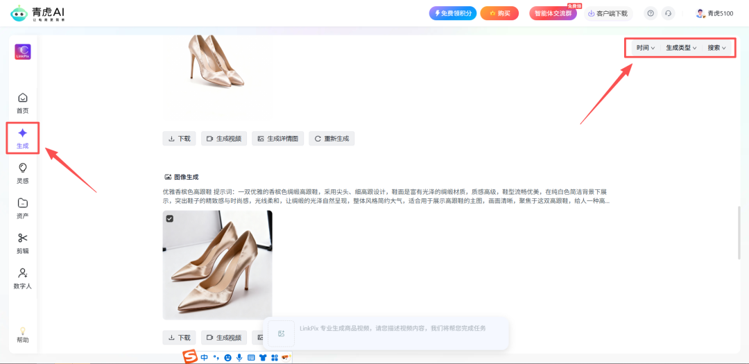 本次改版将视频生成、图片生成等所有创作记录优化汇总至同一页面,新增多重搜索功能:支持按时间、生成类型、关键词精准搜索历史记录,快速定位所需作品,方便创作者快速搜索过往优质创意和素材。