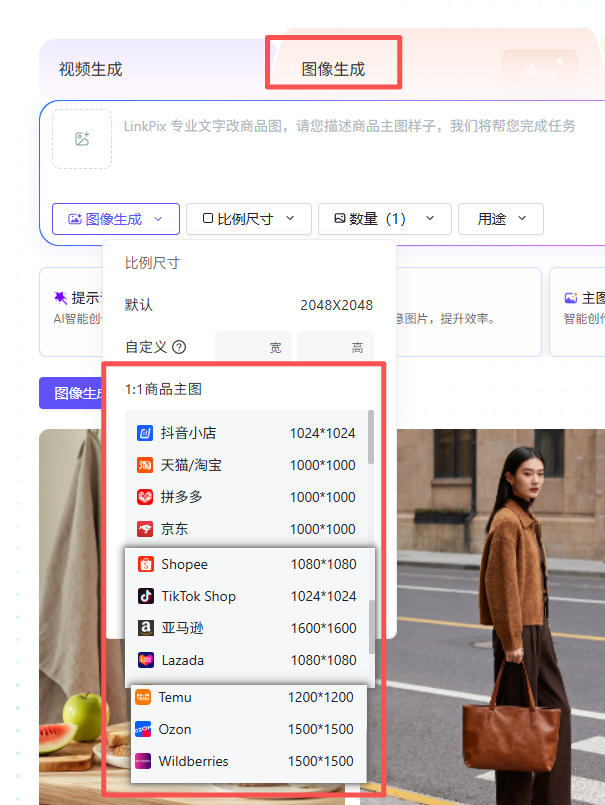 提供抖店、天猫/淘宝、拼多多、京东、Shopee、TikTok shop、亚马逊等主流电商平台主图尺寸一键生成,生成即可直接上传至平台,无需反复调整尺寸;