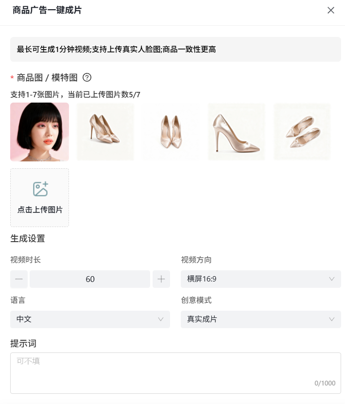 支持上传商品图/模特图(含真实人脸),视频时长可自由调节 8-60 秒,无需复杂操作,快速打造吸睛长视频。