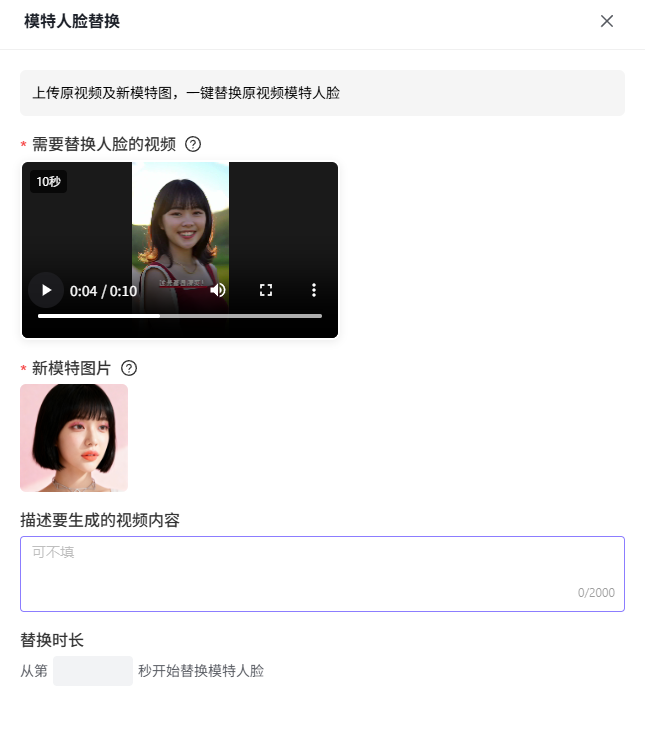 上传目标人像即可一键替换视频人脸,不仅能保留原视频质感,还支持按秒数自定义替换时长,人物形象灵活切换。