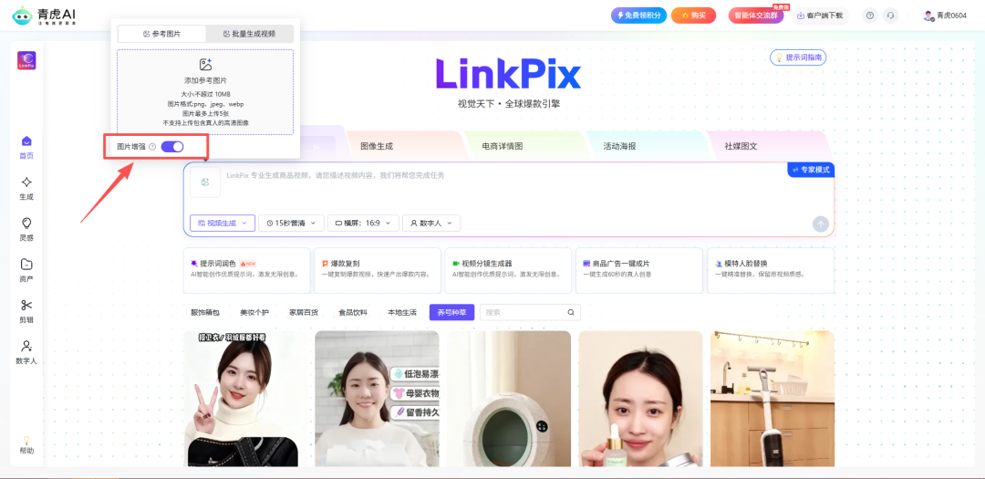 新增图片增强功能,可自行开启或关闭,上传产品图后AI自动识别同款相似产品,可提升AI对产品的理解度,有效降低产品变形率,生成效果更贴合产品。