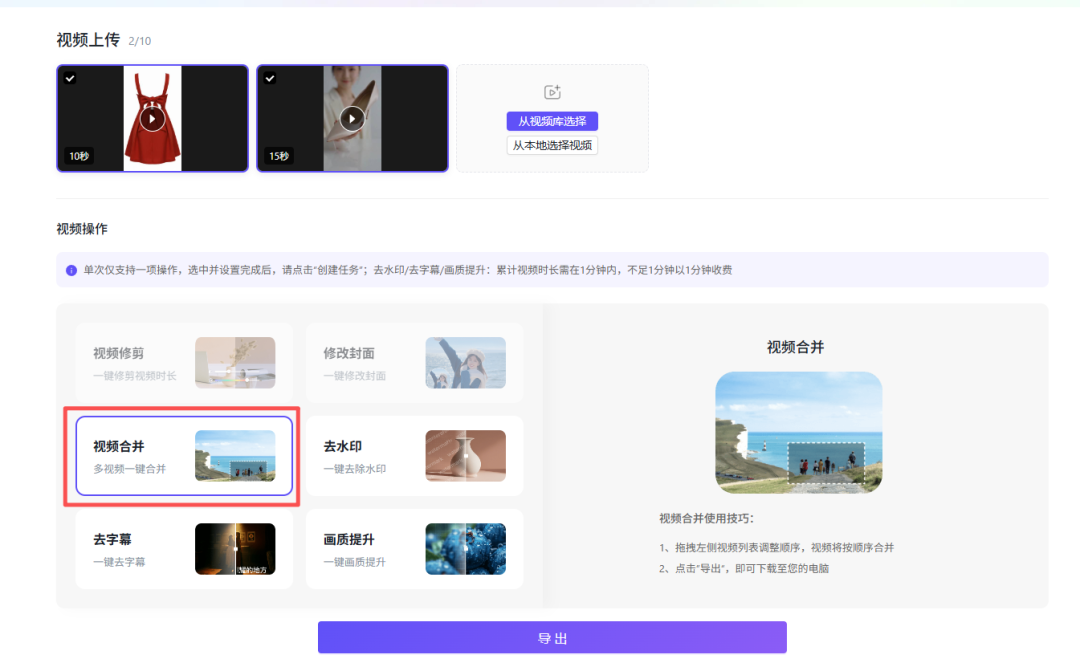 支持从视频库和本地上传剪辑视频,支持拖拽改变视频顺序,上传的视频时长需在1分钟以内,最多可同时上传10个视频。